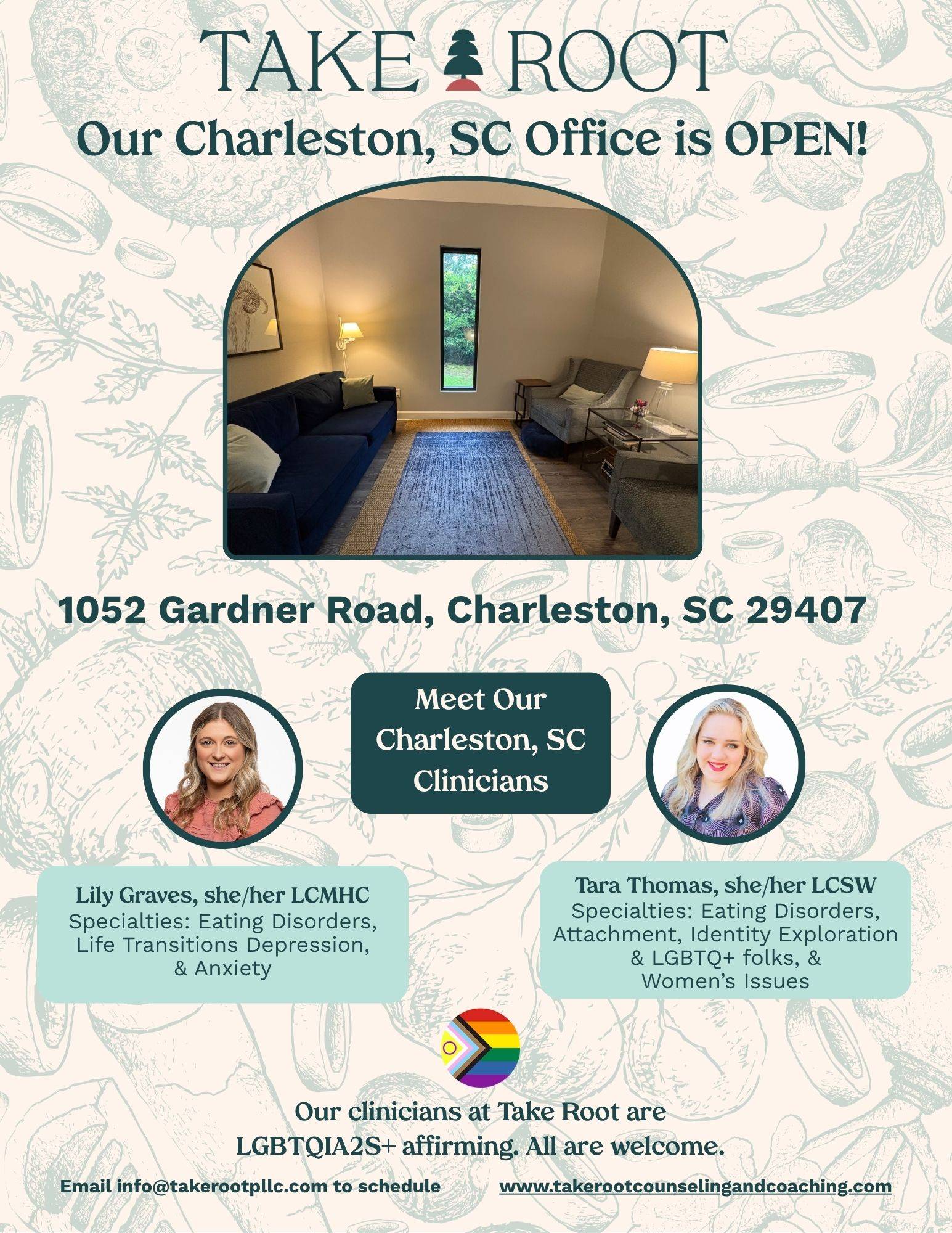 Here we GROW again! Take Root is expanding and has recently opened a new office in Charleston, SC! We are beyond thrilled to offer in-person and virtual support provided by our clinical team, Lily Graves and Tara Thomas. Both Lily and Tara have availability now for new clients:https://www.takerootcounselingandcoaching.com/contact/