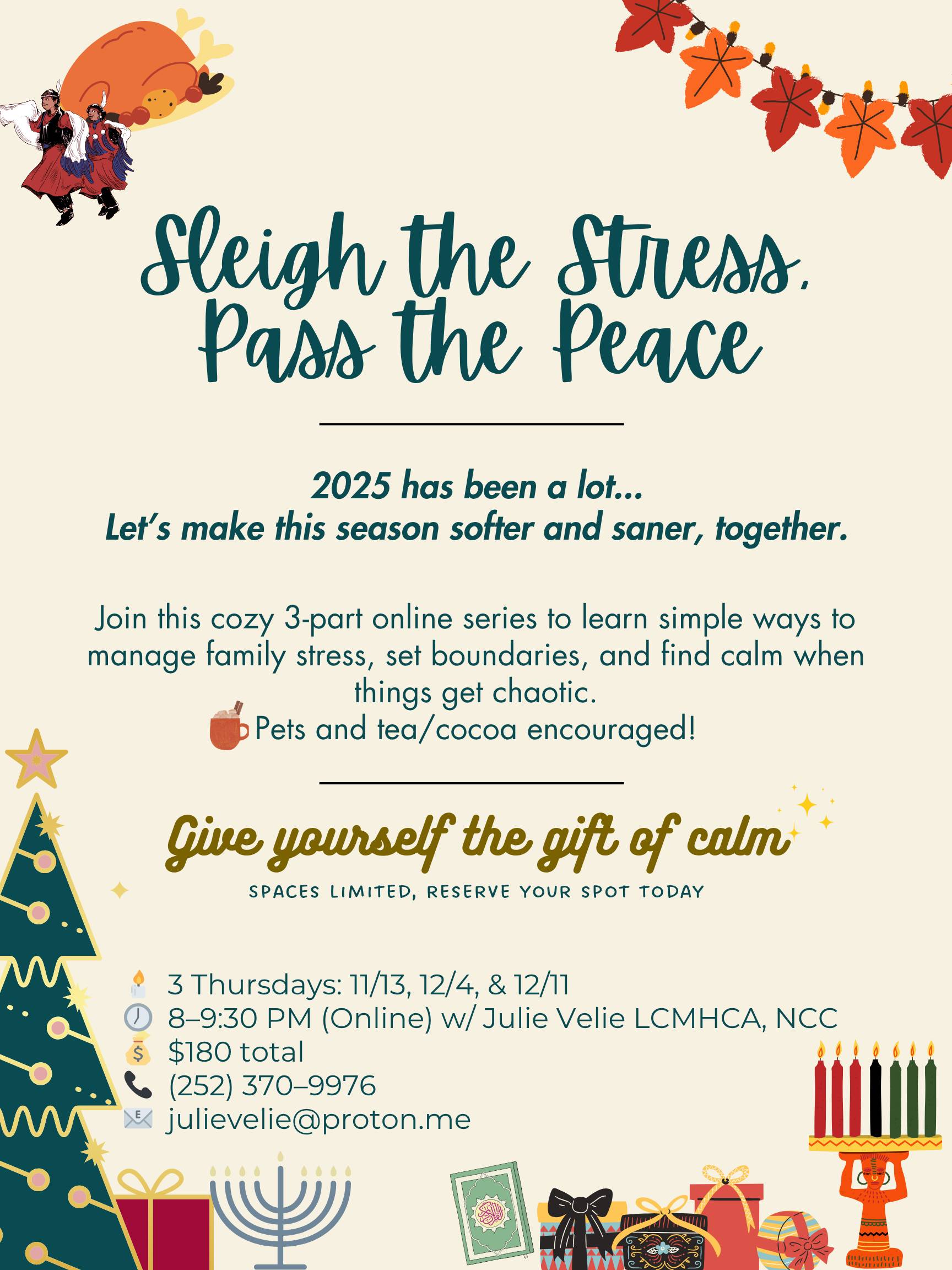 Our community partners at Mindful Collaboration are offering a 3-part online series to help folk manage the stressors that so many experience during the holiday season. If this group sounds supportive consider contacting Julie at julievelie@proton.me to register